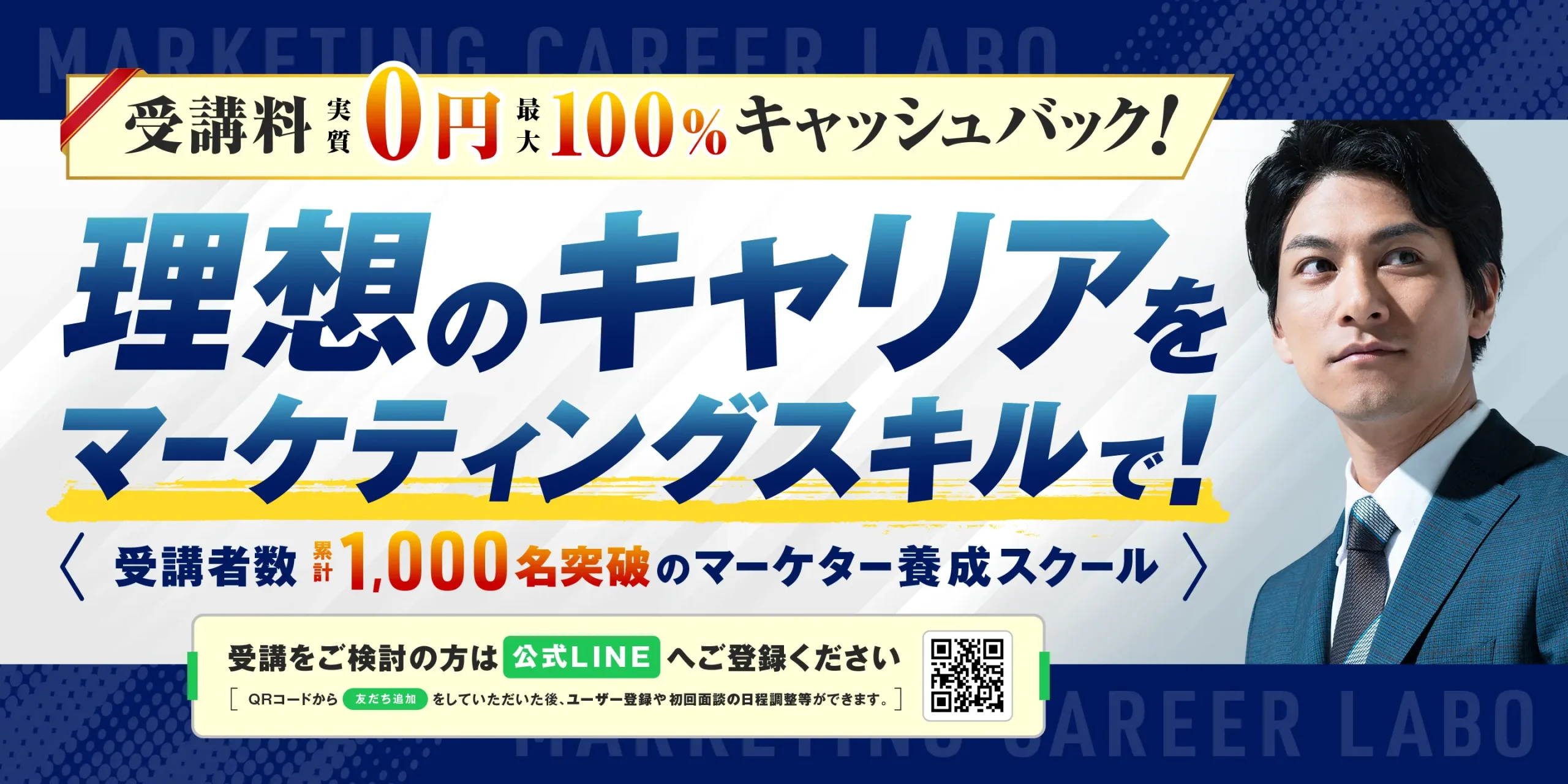 マケキャリは経済産業省による「リスキリングを通じたキャリアアップ支援事業」に採択されており、他採択スクールと同様に最大で受講価格(税抜)の70%をキャッシュバックを受けることができます。また自社独自のキャッシュバック制度も追加で設けており、コース修了時点にて30%のキャッシュバックをさせていただくため、コース終了時に合計で受講価格の全額である100%をキャッシュバック致します。